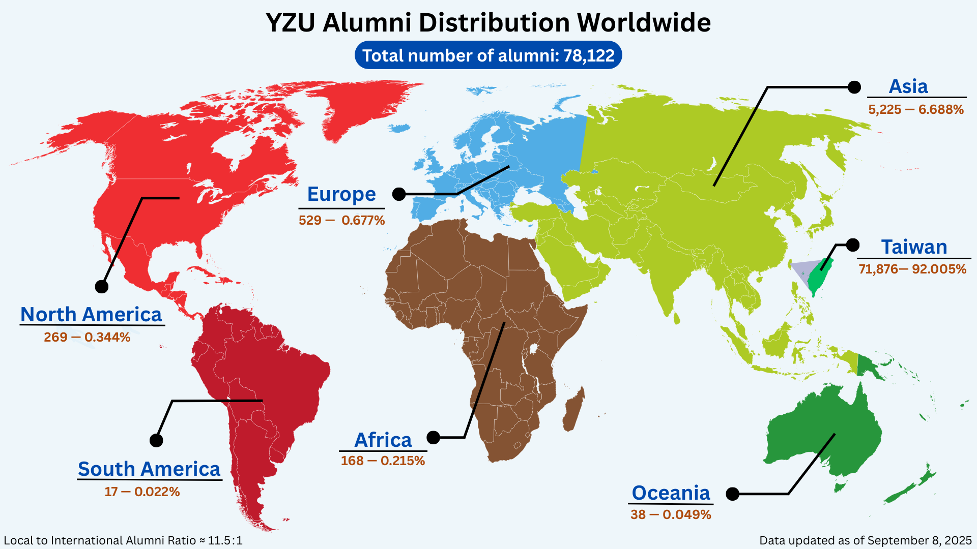 Yuan Ze alumni are located all over the world. Through the enthusiastic participation of alumni in local organizations, a global alumni network has been established. These associations aim to deepen local connections, strengthen ties with the alma mater, and contribute to social progress.