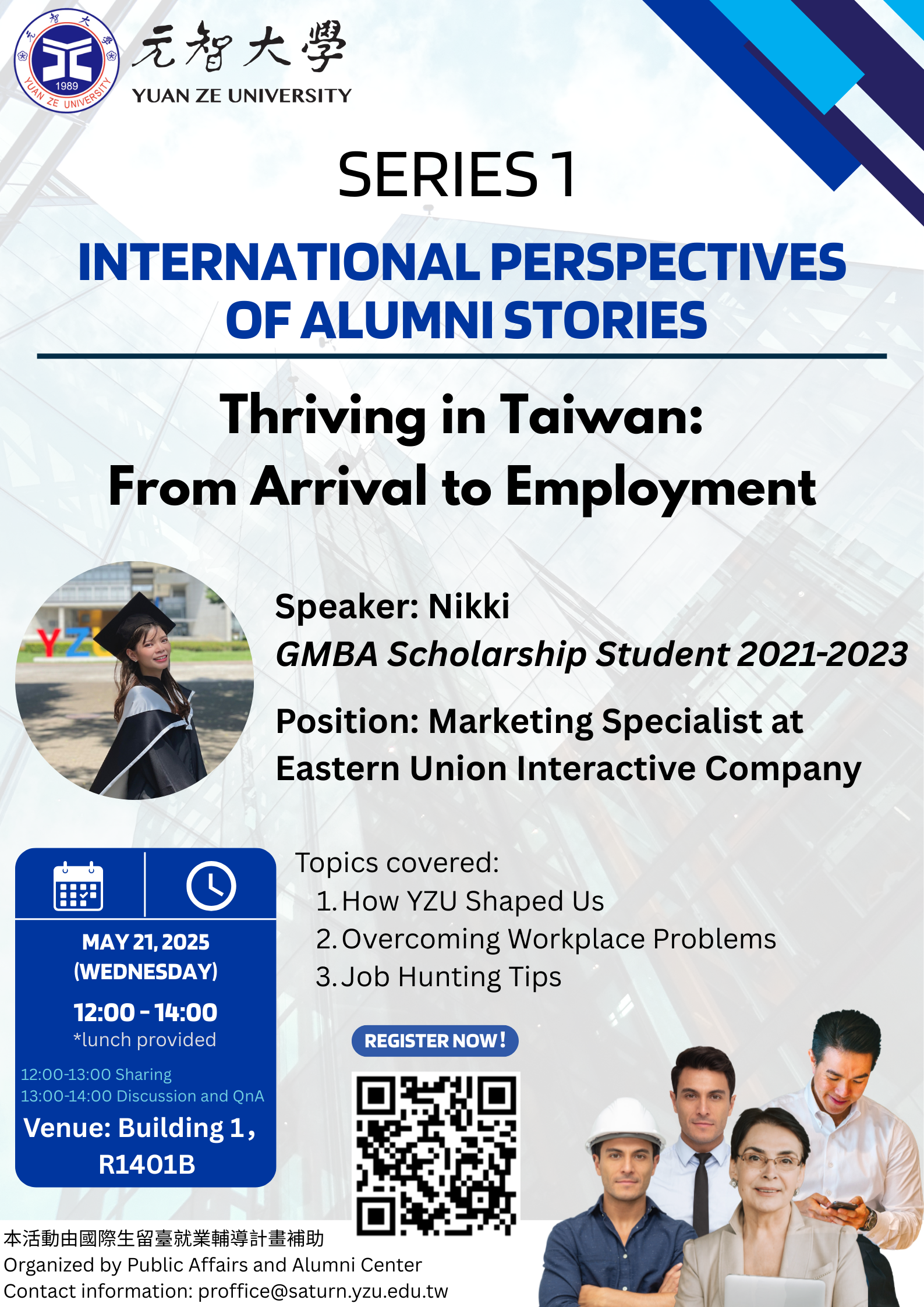 ⏰: 12:00 p.m. – 2:00 p.m. TST 📍: Yuan Ze University, R1102 Open to: Alumni and guests Click here for details Click here to register |