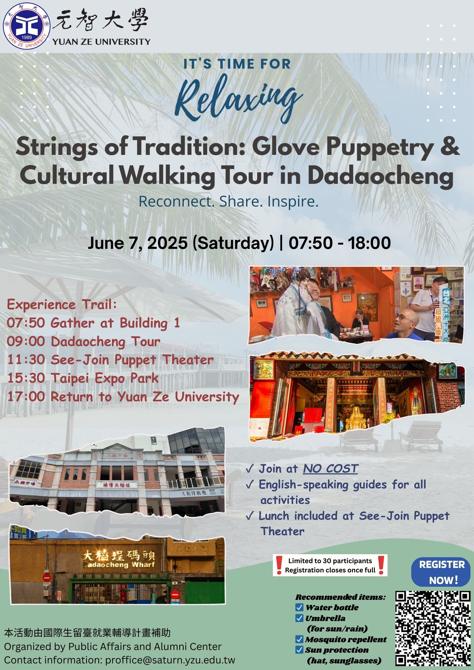 ⏰: 7:50 a.m. – end TST 📍: Dadaocheng Area (Taipei) Open to: Alumni and guests Click here for details Click here to register |