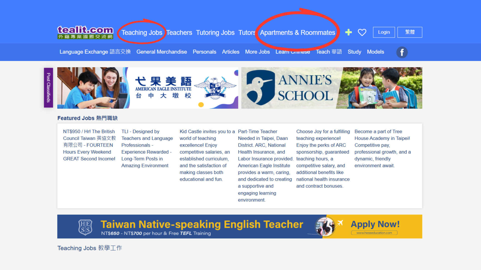 Tealit (Teaching English and Living in Taiwan) is an online information platform that provides resources for foreigners in Taiwan, especially those seeking English teaching opportunities. The platform includes job postings, housing information, language exchange listings, and practical guidance for everyday life in Taiwan.