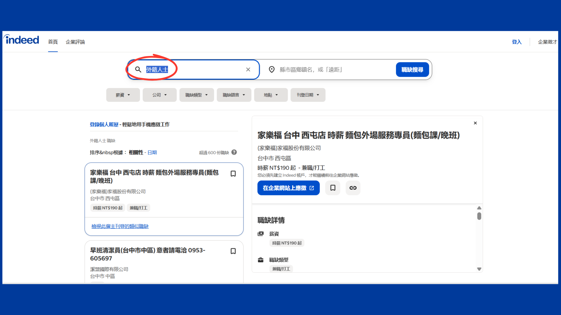 To start your search, visit the official Indeed Taiwan website or click here to explore job listings for foreigners in Taiwan.