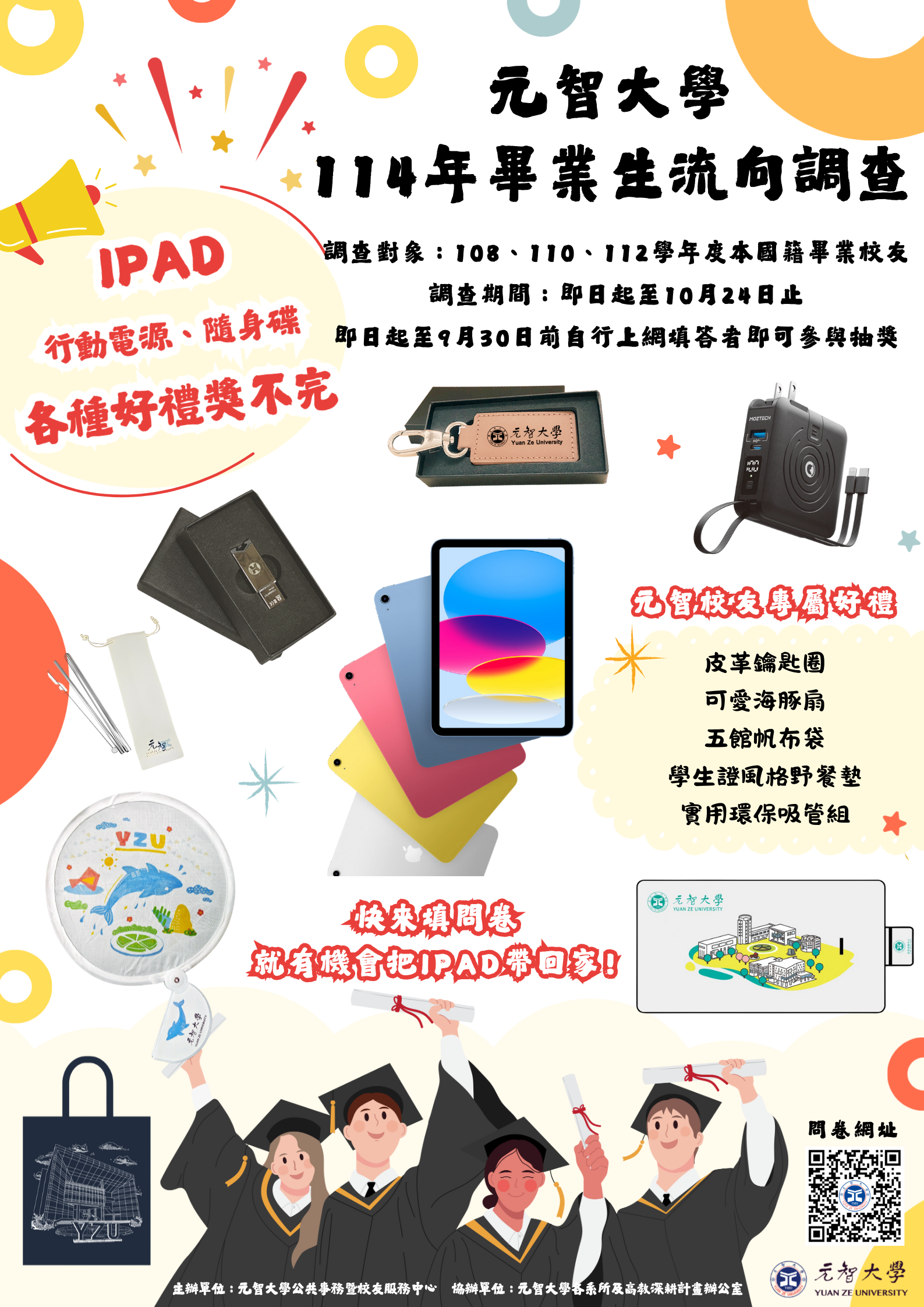 學校十分關心您的發展與想法,懇請您撥冗於 114 年 10 月 24 日(週五)前 填寫「元智大學畢業生流向問卷」。